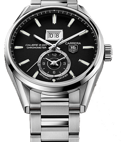 Новинка 2013 Calibre 8 Grande Date - GMT - COSC - 41 мм чудово підходять для любителів подорожей. У конструкції автоматичного механізму TAG Heuer Calibre 8 передбачені великі цифри дати, видимі через накладне вікно зі скошеними гранями, що знаходиться в положенні "12 годин". Великий 41-міліметровий корпус передбачає відображення лічильника другого часового поясу GMT в положенні «6 годин».