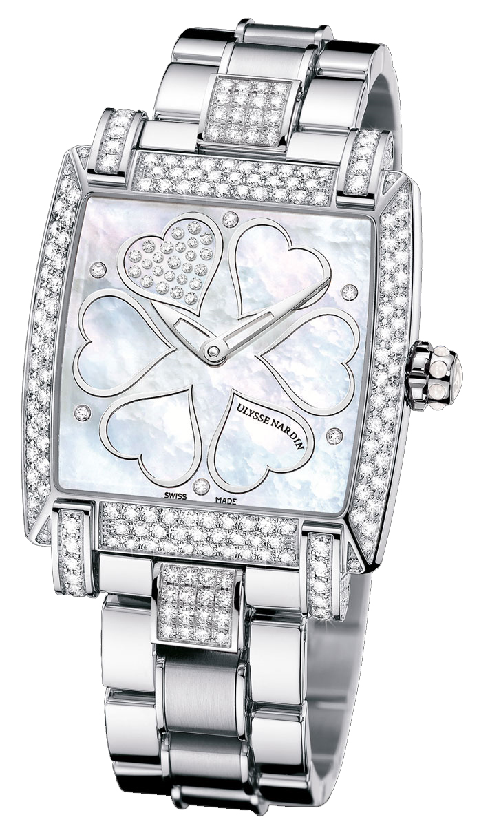 Механізм – автоматичний. Корпус – нержавіюча сталь, інкрустований білими діамантами. Циферблат – білий перлинний, інкрустований 30 білими діамантами. Запас ходу – 42 години. Ремінець – браслет з нержавіючої сталі, інкрустований білими діамантами, відкидна застібка. Водонепроникність 50 м