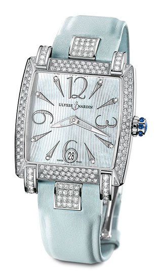Чарівні та елегантні, ці годинники є каноном Caprice. Вони вдало поєднують у собі механіку часу з ювелірним мистецтвом Ulysse Nardin, представленим у серії Caprice - шедевром годинної та дизайнерської майстерності, створеним для жінок, які прагнуть зробити собі задоволення, прикрасивши себе механічним ювелірним виробом. Діаметр 34х35.4 мм. Корпус нержавіючої сталі, інкрустований діамантами (2.1 карат). Блакитний циферблат із гільєшем у вигляді смуг. Механіка з автозаводом, запас ходу приблизно 42 години. Заводна головка прикрашена сапфірами. Водонепроникні 50 м. Скло - сапфір. Ремінець гладкої шкіри зі сталевими вставками, прикрашеними діамантами. Застібка відкидна.