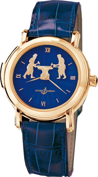 Пронизливо синій емалевий циферблат годинника Ulysse Nardin Forgerons Minute Repeater прикрасили нові фігурки молотобойців, що рухаються, виконані з 18-каратного рожевого золота.