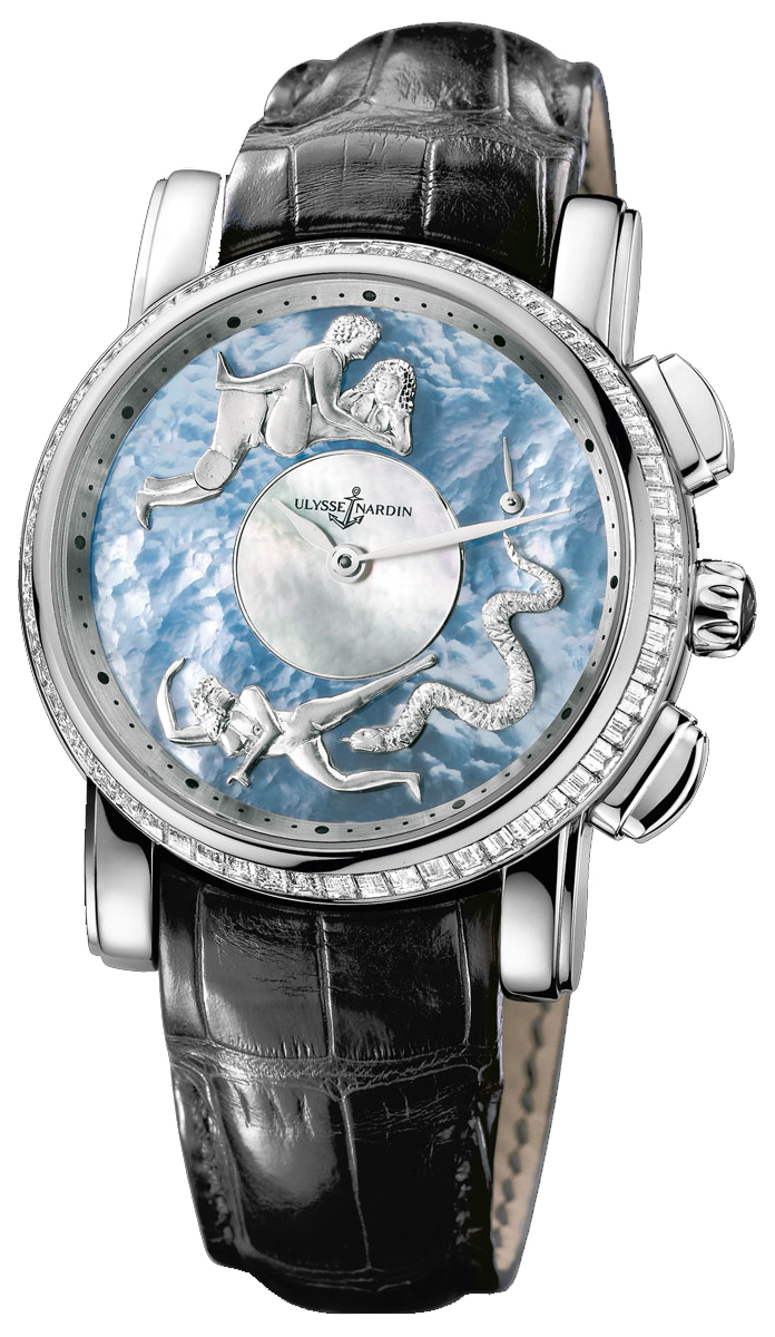 Механізм – автоматичний, Калібр UN-75. Корпус – платина 950. Безель інкрустований білими діамантами багетної форми.