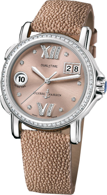 Унікальний та зручний в обігу годинник Dual Time Ladies з великим подвійним віконцем для дати. Діаметр 37 мм. Корпус із нержавіючої сталі, прикрашений діамантами по 0,80 кар. Циферблат перламутрового кольору з діамантами. Механіка з автопідзаводом та запасом ходу близько 42 годин. Водонепроникність 100 м. Скло – сапфір. Браслет зі шкіри схилу з застібкою, що відкидається.