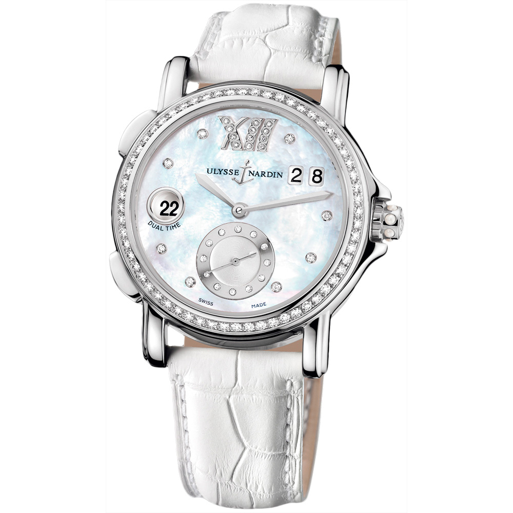 Ulysse Nardin прикрашений 60 діамантами, механізм UN-24 (28 800 напівколивань/год), години, хвилини, маленька секундна стрілка, індикація числа, другий часовий пояс, циферблат прикрашений 8 діамантами, запас ходу 42 години, шкіряний ремінець.