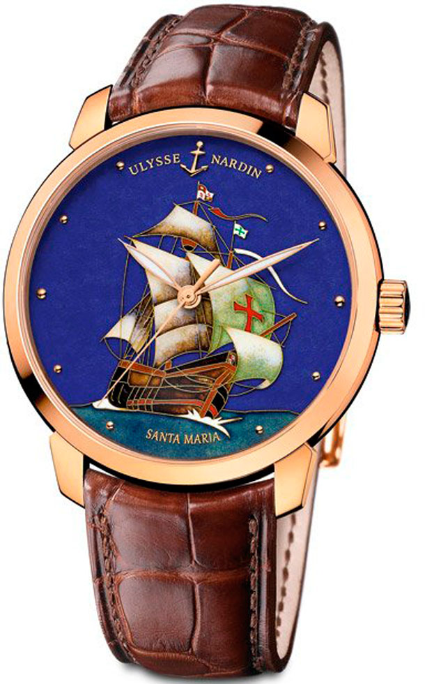 Нова модель Classico Limited Edition Santa Maria від швейцарського бренду Ulysse Nardin названа на честь флагманського корабля першої експедиції Христофора Колумба до Америки в 1492 році. Круглий корпус із 18-каратного білого (Ref. 8150-111-2/SM) або рожевого (Ref. 8156-111-2/SM) золота діаметром 40 мм, водонепроникний до 50 метрів. Сапфірове скло встановлено на передній стороні корпусу (з покриттям антивідблиску) і на його задній кришці, що загвинчується. На циферблаті розміщено художнє кольорове зображення корабля Santa Maria, виконане у техніці перегородчастої емалі. Для цього була використана мініатюрна сітка із золотої нитки, довжина якої склала більше 500 метрів, а товщина – не більше волоска. Саме в цю сітку заливалися окремі різнокольорові фрагменти емалі, які створили цілий малюнок. Для виготовлення одного циферблату потрібно понад 50 годин кропіткої роботи майстрів-емальєрів, протягом цього часу необхідно виконати 26 різних технологічних операцій. На циферблаті є також дванадцять круглих золотих годинникових індексів і центральні стрілки (у тому числі годинна і хвилинна з білим люмінесцентним покриттям). Модель оснащена автоматичним механізмом Ulysse Nardin 815, із запасом ходу 42 години, функціями аналогової індикації годин, хвилин та секунд. Калібр офіційно сертифікований COSC як хронометр. Поставляється на синьому шкіряному ремінці із золотою застібкою. Лімітований випуск по 30 екземплярів у білому та рожевому золоті.