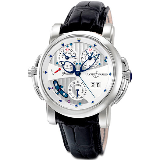 На білому циферблаті розташовані віконце дати та три додаткові циферблати: другий час (за Грінвічем, UTC), будильник та таймер. Корпус білого золота (18 карат), діаметр 42 мм. Циферблат білий. Запас ходу близько 42 години. Водонепроникність 30 м. Скло – сапфір. Браслет шкіряний з застібкою, що відкидається.