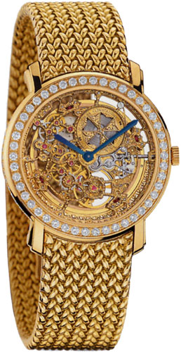 Прекрасний годинник ручної роботи з прозорим корпусом. Як лицьова, так і задня стінка корпусу виконані із кристала сапфіру. Стрілки – вороненої сталі. Всі деталі прикрашає чудове ручної роботи гравіювання. Годинник інкрустований 77 діамантами загальною вагою 1,38 карата.