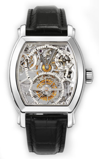 Годинник у платиновому корпусі. Прозорий циферблат дозволяє бачити їхній чарівний механізм. На турбійоні у зоні 6 годин розташований додатковий секундний циферблат, у зоні 1 години – дата та у зоні 10 годин – індикатор запасу ходу. 27 каменів.