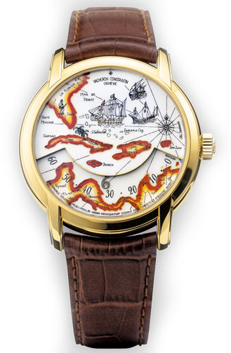 Через чотири роки після першого показу, що швидко стала легендою серії Patrimony Explorers, створеної на честь великих дослідників, Vacheron Constantin представляє дві нові моделі, цього разу віддаючи данину Маркусу Полюсу і Христофору Колумбу. Основна дана жеско лімітованої колекції безперечно чудовий складний механізм і залучене артистичне ремесло емалювання. Цьогорічні шедеври випущені тиражами по 60 екземплярів кожен. Стилізовану карту захищає сапфірове скло. Корпус виконаний з 18-ти каратного жовтого золота діаметром 40 мм та товщиною 12,2 мм. Автоматичний калібр Vacheron 1126AT на 36 каменях б'ється з частотою 28800 bph і має запас ходу 40 годин. 12 годинних покажчиків виїжджають по черзі в нижньому секторі шириною 132 градуси, вказуючи на хвилинну шкалу поточний час.