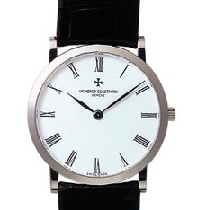 Класичний білий циферблат із великими римськими цифрами та емблемою Vacheron Constantin. 18 каменів.