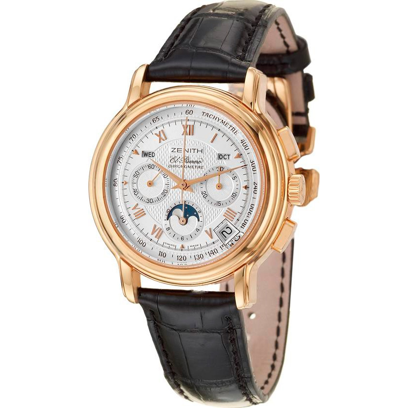 Корпус рожевий золото. Діаметр 40мм. Механічний хронограф із автопідзаводом. Механізм El Primero 410. 31 камінь. 36000 напівколивань/година. Число, день тижня, місяць, фази місяця. Циферблат - посріблений з обробкою гільйоше. Ремінь із шкіри алігатра. Сапфір. На задній кришці вікно сапфіра з видом на механізм.
