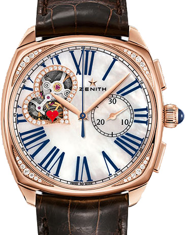 Новий корпус форми "подушка", рожеве золото з діамантами. Віконце в циферблаті відкриває вид на механічне «серце» годинника – знаменитий калібр El Primero. Автоматичний хронограф El Primero з колонним колесом калібр El Primero 4062 (діаметр: 30 мм) з кількістю деталей 253 на 31 дорогоцінному камені з балансовою частотою 36 000 пк/год (5 Гц) і запасом ходу 50 годин. Ротор з обробкою "Côtes de Genève".
