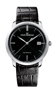 Классически элегантные часы, на черном с крупными серебристыми стрелками и часовыми метками циферблате которых расположено прямоугольное окошечко даты. Частота 28 800 полуколебаний в час. 27 камней.