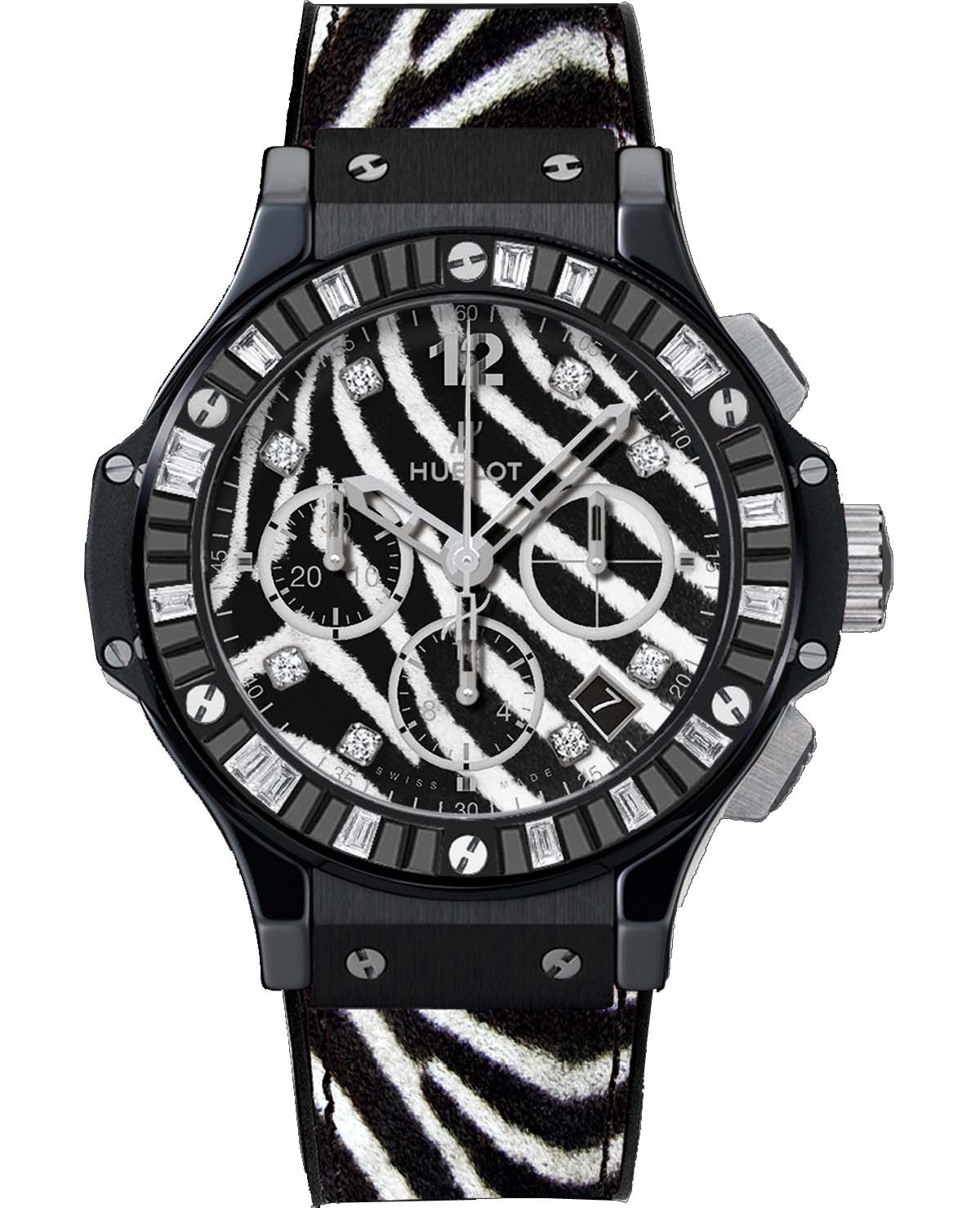 Полосатый черно-белый циферблат привлекает не только выразительной окраской, но и дополнительной отделкой в виде 8 бриллиантовых маркеров. Не обошлось и без традиционных элементов – центральных стрелок (часовая и минутная скелетонизированные), секундного, 12-часового и 30-минутного циферблатов на 3, 6 и 9 часах соответственно и апертуры даты между 4 и 5 часами. Керамический безель также оформлен в виде «зебры» - на нем чередуются черные топазы и бриллианты.