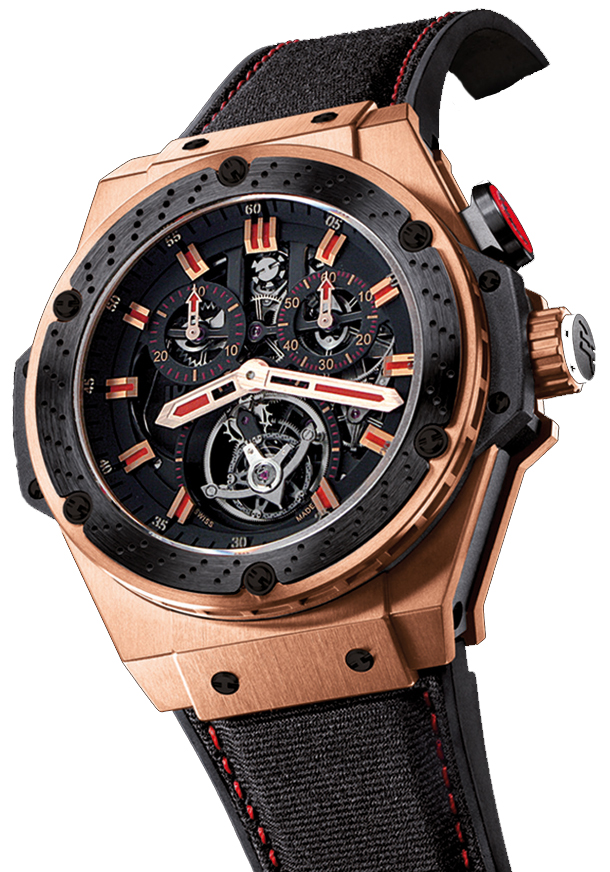 Механизм с ручным заводом, Калибр HUB 7300. Корпус - розовое золото 18к, керамика, каучук. Циферблат - черный с красным.