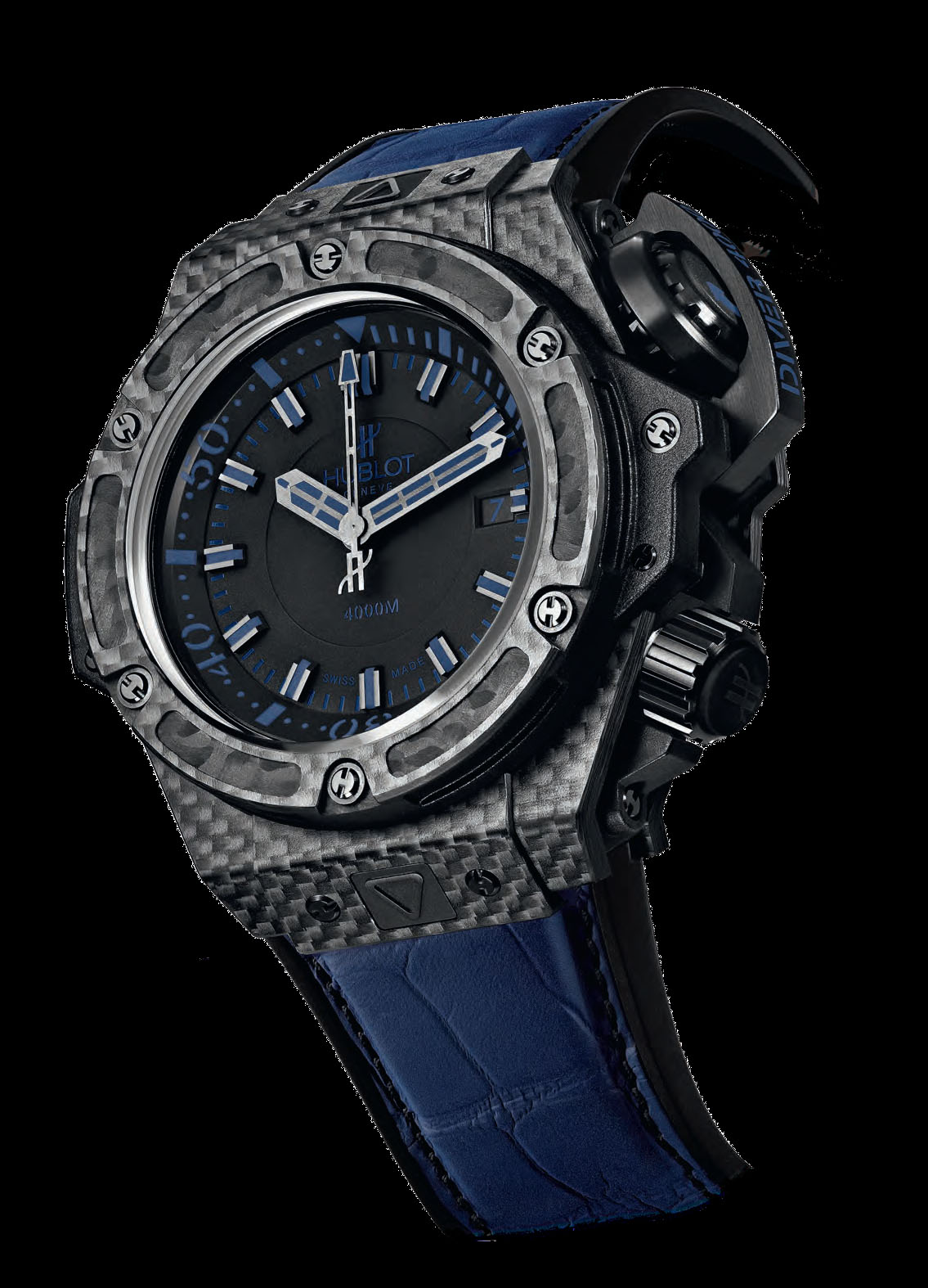 Новая модель King Power Carbon размером 48mm выполнена из карбона, безель из каучука. Водонепроницаемость 4000 метров (400 ATM. Матовый черный циферблат с голубыми люминесцентными метками. Механизм с автоподзаводом, калибр