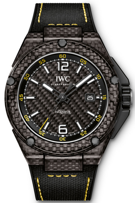 Чтобы отметить свое текущее сотрудничество с Mercedes AMG PETRONAS Formula 1 ™ команда IWC представляет новые большие высокотехнологичные модели с углеродным волокном: Carbon Ingenieur с автоматическим заводом. В средней части корпуса, безель, который держится на пяти винтах, производится по тому же принципу, что и моноблок из гоночного автомобиля: карбоновые волокна замачивают в эпоксидной смоле и придают желаемой формы до обжига, потом при высокой температуре и давлении запекают форму.Корпус тоже сделан из углеродного волокна. Часы однозначно отражают дух Формулы 1. Материал карбон занимает лишь одну пятую веса стали, но имеет большую устойчивость к ударам или царапинам. Для других частей корпуса, IWC дизайнеры черпали вдохновение из материалов, используемых в ведущих новшествах для создания болидов. 5 керамических винтов, каучуковая защита над заводной головкой, титановые винты на задней крышке. Матерчатый-нейлоновый ремешок с желтой прошивкой идеально сочетается с желтыми цифрами, нанесенными на внешних стенах циферблата. Благодаря встроенной амортизационной системе, механизм калибра IWC-80110 имеющий запас хода в 44 часа, не зависит от экстремальных ускорений, а также резкого торможение маневров и вибрации, что делает часы идеальными для гонщиков и людей, любящих экстразональные виды спорта. В соответствии с часами, дизайнеры так же сделали индивидуальный ротор автоподзавода, который имеет форму поршней.