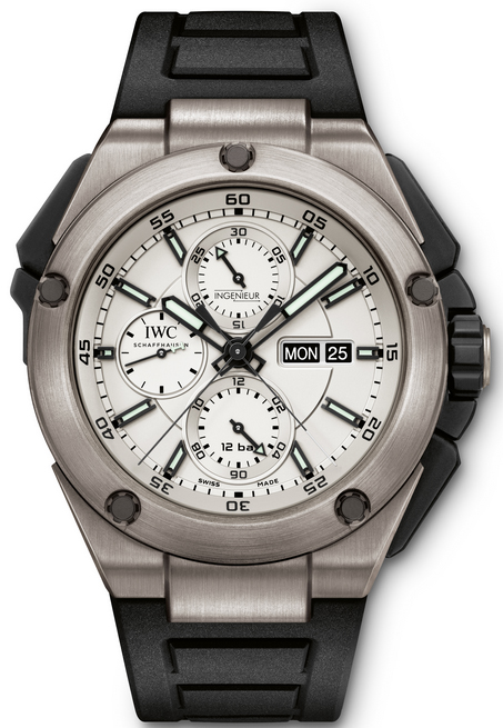 В соревнованиях Formula One, точное время прохождения круга, дают важную информацию о различных технических параметрах ресурсов автомобиля и ход гонки. Во время получения должной квалификации, водитель должен пройти круг трассы с самым быстрейшим временем. Таким образом, стало ясно, что новая модель INGENIEUR DOUBLE CHRONOGRAPH TITANIUM из коллекции Ingenieur, которая стала творением благодаря тесному сотрудничеству между IWC и Mercedes AMG PETRONAS, должна быть оснащена двойным хронографом.Сплит-секундная стрелка может быть остановлена для записи промежуточных отрезков времени, а стрелки секундомера продолжает работать. Если кнопку в положении на "10 часов" нажата второй раз, стрелки сплит- секундомера синхронизируются. Для этой модели Ingenieur Chronograph Titanium был разработан новый калибр 79420. Дизайнеры IWC взяли свое вдохновение из материалов, обычно используемых в болидах Formula One: корпус изготовлен из титана с благородной матовой полировкой, винты сделаны из керамики.Заводная головка и кнопки покрыты черным каучуком. В часах на бело-серебристом циферблате идеально просматриваются черный цифры и серебристые стрелки с люминесцентным покрытием.
