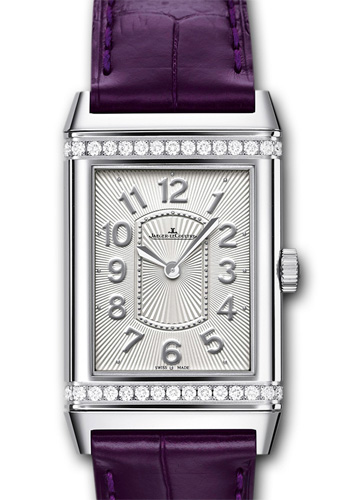 Новая стильная модель Reverso Grande Lady Ultra Thin выпущена в 2013 году, не оставит равнодушной ни одну женщину и будет особенно интересна любительницам белого метала (нержавеющей стали) и элегантного темно-фиолетового ремешка. Часы имеют новое лицо и характер, гладкие полированные углы и тонкие линии придают новинке нового дыхания и утонченности. Мастера сделали корпус максимально тонким 7.2мм, для большего комфорта и легкости, добавив небольшое количество бриллиантов. Что несомненно радует, что в этот тонкий корпус вмещен механизм с ручным заводом Jaeger-LeCoultre Calibre 846/1 с частотой колебаний баланса - 21 600 пк/час имеет 18 камней, толщина 2,94 мм, 93 детали, запас хода 40 часов. Элегантные, утонченные часовая и минутная стрелки из стали гармонично сочетаются с выраженными арабскими цифрами на гильошированном белоснежном циферблате. Безель инкрустирован 30 бриллиантами ~0.42 carats. Ремешок из кожи аллигатора с раскладной застежкой размера 16мм из нержавеющей стали.