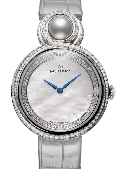 Корпус белое золото 750 пробы. Безель и накладное кольцо инкрустированы 128 и 148 бриллиантами (1,621 карата) Белая жемчужина напротив метки «12 часов» и кабошон из белого перламутра Высота 12,7 мм. Чистота: IF-VVS1, бриллиантовая огранка, цвет: D-G Общий вес в каратах: 2,395 карата. Выгравированный на задней крышке индивидуальный серийный номер.Выпуклый циферблат из белого перламутра. Изогнутые стрелки из вороненой стали.