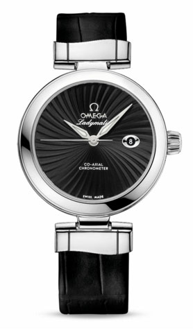 Новые часы Ladymatic воплощают в жизнь каждой женщины грациозность и элегантность. Эти часы – настоящий подарок для прекрасной половины человечества, мечтающих о высокоточных механических часах с современным модным дизайном. Под волнообразным узором полированного корпусного кольца можно увидеть еще одно кольцо – из керамики. Часы размером 34 мм, корпус выполнен из нержавеющей стали. Заводная головка украшена бриллиантом фирменной огранки или логотипом Omega. Сквозь сапфировое стекло обратной стороны можно рассмотреть механизм часов. Механизм часов кварцевый, калибра Omega 8520/8521 . Все часы серии Ladymatic являются официально сертифицированными хронометрами, что свидетельствует о безупречной точности хода. Циферблат украшен узором напоминает лучи, которые расходятся из центра. Циферблат так же может быть украшен 11 бриллиантами вместо часовых меток. Апертура даты размещена на позиции 3-х часов. Стрелки выполнены из стали и покрыты белым составом Суперлюминова, что позволяет узнать время при любом освещении. Часы представлены с браслетом из стали или с ремешком из кожи аллигатора в тон циферблату, с раскладной застежкой имеет особую, запатентованную компанией Omega конструкцию, состоящую из трех рядов звеньев.