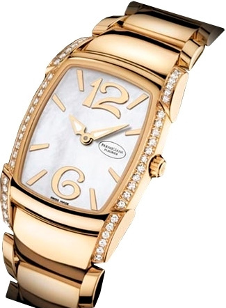 Корпус 33,8х36мм. из 18-каратного розового золота инкрустирован белыми бриллиантами. Циферблат - белый жемчужный. Браслет из розового золота, 18к, откидная застежка.