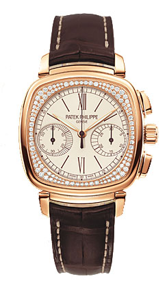 First Ladies Chronograph пополнят коллекцию элегантных и сложных часов мануфактуры. Корпус - розове золото, внутренний безель инкрустирован 136 бриллиантами. Сапфировое окно на задней крышке корпуса обеспечивает визуальный доступ к механизму.