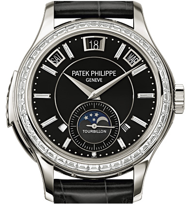 На завершившейся несколько дней назад международной часовой выставке Baselworld-2013, швейцарская часовая компания Patek Philippe представила свою новую модель Grand Complications Perpetual calendar - Minute repeater - Тourbillon Platinum, дизайн которой выполнен в элегантном черном цвете, безель из 40 белых багетных бриллиантов (~3.91 ct), классическая застежка из 6 белых багетных бриллиантов (~0.30 ct), цифеблат из 11 белыми багетными бриллиантами. Модель оснащена швейцарским механизмом Caliber RTO 27 PS QI, с частотой 21600 пол/час, с функциями индикации часов, минут (посредством соответствующих центральных стрелок) маленькой секундной стрелкой совмещенной с индикатор Фаз Луны (в положении на 6 часов) окошком даты в положении на 12 часов, дня недели(в положении между 10 и 11 часами), месяца (в положении между 1 и 2 часами) с запасом хода 38-48 часов. Что самое главное часы имеют самые сложные часовые функции Вечный календарь, Минутный репитир и спрятанный на задней крышке Турбийон. Вечный календарь, включает в себя механизм, самоустанавливающийся на различные количества дней в месяце - 28, 30 или 31. В Вечном календаре также содержится индикатор високосного года. Совершающий один оборот в год, месячный индикатор этих часов соединен с шестеренкой, разделенной на четыре сектора, один из которых указывает високосный год. Эта шестеренка делает полный оборот за четыре года. Таким образом, без вмешательства человека, Вечный календарь точно указывает дату, день недели, месяц, фазы луны и високосный год. Модель утонченная и подойдет истинным любителям высокого часового искусства.