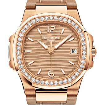 Дизайн новой модели Ladies Nautilus Rose Gold от гранда швейцарского часпрома PATEK PHILIPPE, представленой на проходящей в настоящее время в Базеле международной часовой выставке Baselworld-2013, выполнен полностью в розовом золоте и стал более утонченным. Характерный полированный корпус, изготовленный из 18-каратного розового, диаметром 32 мм, безель инкрустирован 46 бриллиантами (~0.73 ct.)Сапфировое стекло установлено на передней стороне корпуса и на его задней крышке. Циферблат гильшированый, золотого цвета, с накладными часовыми индексами, выполненными, как и стрелки, из золота. Модель оснащена мануфактурным швейцарским кварцевым механизмом Caliber E23-250 S C, функциями индикации часов, минут, секунд (посредством соответствующих центральных стрелок) и даты (посредством цифрового указателя в апертуре, расположенной на 3 часах). Калибр отменно отделан и декорирован. Поставляется на ремешке из кожи крокодила с раскладной застежкой из 18-каратного розового золота.