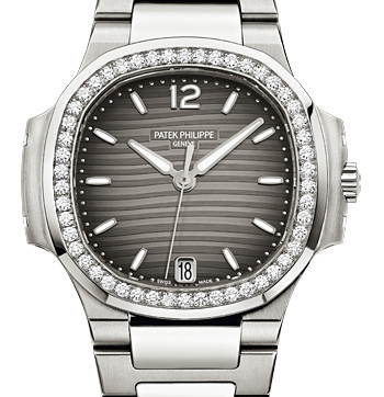 Дизайн новой модели Ladies Nautilus White Gold от гранда швейцарского часпрома PATEK PHILIPPE, представленой на проходящей в настоящее время в Базеле международной часовой выставке Baselworld-2013, выполнен полностью в стали и стал более утонченным. Характерный полированный корпус, изготовленный из нержавеющей стали, диаметром 32 мм, безель инкрустирован 50 бриллиантами (~0.71 ct). Сапфировое стекло установлено на передней стороне корпуса и на его задней крышке. Циферблат гильшированый, темно-серого цвета, с накладными часовыми индексами,арабские цифры и стрелки, из золота. Модель оснащена мануфактурным швейцарским механизмом с автоподзаводом Caliber 324 S C, на 29 камнях, с балансовой частотой 28800 пол/час и запасом хода от 35 до 45 часов. Индикации часов, минут, секунд (посредством соответствующих центральных стрелок) и даты (посредством цифрового указателя в апертуре, расположенной на 6 часах). Калибр отменно отделан и декорирован. Поставляется на браслете с раскладной застежкой из стали.