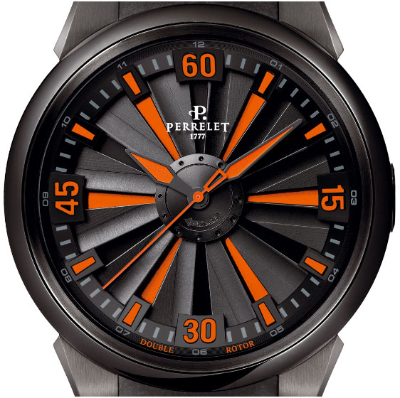 Еще одно удачное дизайнерское решение по стилизации двойного ротора, на этот раз в мужской модели нашли в компании PERRELET. В соответствии с названием - Turbine Collection, двойной ротор автоподзавода в часах новой коллекции стилизован под лопатки турбореактивного двигателя самолета.