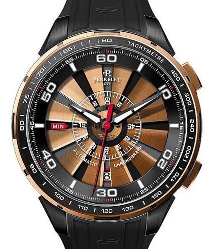 Новая модель 2013 года,Turbine Chrono от швейцарской часовой компании Perrelet является первым хронографом в коллекции Turbine, с момента запуска последней в 2009 году. Модель выпускается в пяти версиях. Данная модель выполнена из нержавеющей стали с DLC покрытием и розовым золотом 18 карат.