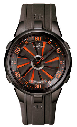 Еще одно удачное дизайнерское решение по стилизации двойного ротора, на этот раз в мужской модели нашли в компании PERRELET. В соответствии с названием - Turbine XL Collection, двойной ротор автоподзавода в часах новой коллекции увеличенного размера стилизован под лопатки турбореактивного двигателя самолета.