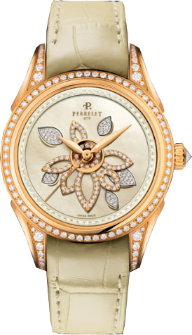 Сегодня же Perrelet создал то, что можно по праву назвать новой категорией дамских часов, сочетающей в себе два ранее отличных друг от друга мира – мир драгоценностей и мир часовой механики. В основе мира ювелирных изделий всегда лежала чисто эстетическая подоплека. Снабдив же драгоценности дополнительной функцией, Perrelet превратил их фактически в элемент механики. Копрус этих удивительных часов из розового золота с 293 бриллиантами (2.3 carats) не оставляет равнодушной прекрасную половину человечества. Ремешок оливкового цвета из кожи аллигатора.