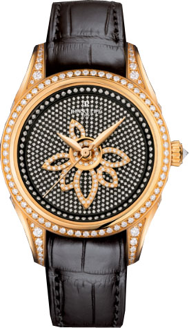 Сегодня же Perrelet создал то, что можно по праву назвать новой категорией дамских часов, сочетающей в себе два ранее отличных друг от друга мира – мир драгоценностей и мир часовой механики. В основе мира ювелирных изделий всегда лежала чисто эстетическая подоплека. Снабдив же драгоценности дополнительной функцией, Perrelet превратил их фактически в элемент механики. Копрус этих удивительных часов из розового золота с 1057 бриллиантами (4.63 carats)не оставляет равнодушной прекрасную половину человечества. Ремешок ярко-черного цвета из кожи аллигатора.