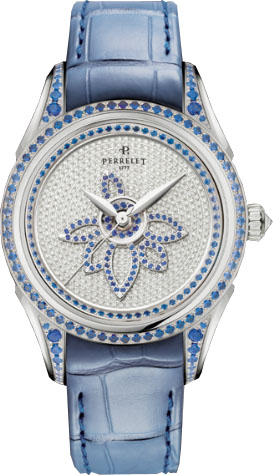 Сегодня же Perrelet создал то, что можно по праву назвать новой категорией дамских часов, сочетающей в себе два ранее отличных друг от друга мира – мир драгоценностей и мир часовой механики. В основе мира ювелирных изделий всегда лежала чисто эстетическая подоплека. Снабдив же драгоценности дополнительной функцией, Perrelet превратил их фактически в элемент механики. Копрус этих удивительных часов из белого золота с инкрустирован бриллиантами и сапфирами не оставляет равнодушной прекрасную половину человечества. Ремешок ярко-голубого цвета из кожи аллигатора.