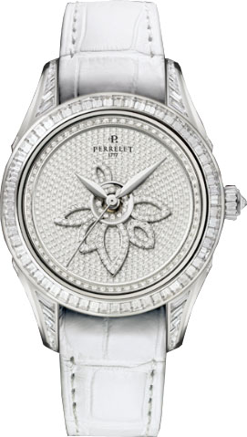Сегодня же Perrelet создал то, что можно по праву назвать новой категорией дамских часов, сочетающей в себе два ранее отличных друг от друга мира – мир драгоценностей и мир часовой механики. В основе мира ювелирных изделий всегда лежала чисто эстетическая подоплека. Снабдив же драгоценности дополнительной функцией, Perrelet превратил их фактически в элемент механики. Копрус этих удивительных часов из белого золота с инкрустирован 1045 бриллиантами (10.48 carats) не оставляет равнодушной прекрасную половину человечества. Ремешок ярко-зеленого цвета из кожи аллигатора.