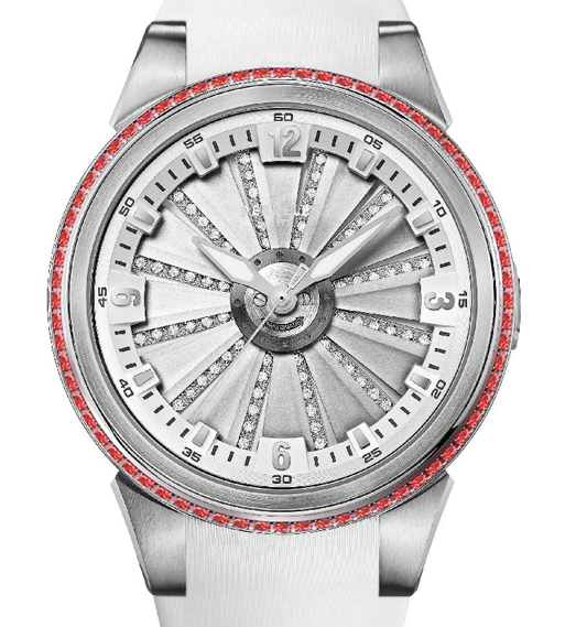 Турбина, перекрашенная в сочные оттенки над белоснежным циферблатом, открывая взору 75 вспыхивающих на свету бриллиантов (0,36 карат). Им вторит сиянием 68 красных рубинов (1,08 карат) примостившихся по периметру стальных корпусов.