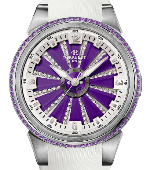 Швейцарская марка Perrelet анонсировала богатую на гастрономические мотивы серию женских наручных часов, которая получила название Turbine XS Taste. Главное отличие часов этой коллекции в том, что в их внешнем оформлении на смену исключительно холодному блеску аристократически-холодных камней пришли более земные символы: Turbine выполнены в цветах лесных ягод и фрутов. Турбина, перекрашенная в сочные оттенки ежевики над белоснежным циферблатом, открывая взору 75 вспыхивающих на свету бриллиантов (0,36 карат). Им вторит сиянием 68 аметистов (0.8 карат) примостившихся по периметру стальных корпусов.