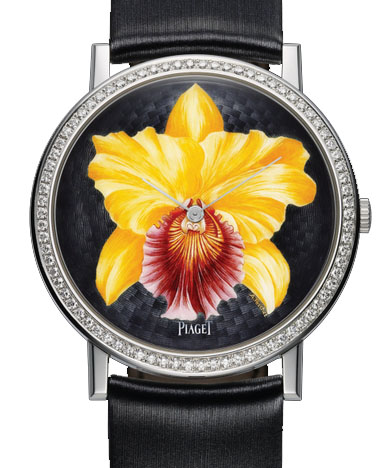 Piaget вновь обращается к миру орхидей, создавая 4 уникальных, завораживающих произведения часового и ювелирного искусства. Художница-эмальер украсила циферблат этих часов миниатюрой, изображающей орхидею Laeliocattleya «Irene yellow». Цветок, выполненный в технике эмали «grand feu», изображен на фоне, который был вручную украшен тонким гильошированным узором, а затем покрыт слоем прозрачной эмали «flinqué». Мастерство эмальера и гравера находит продолжение в работе часовщиков Piaget, владеющих всеми секретами создания ультратонких механизмов, декорированных в соответствии с принципами Высокого часового искусства.