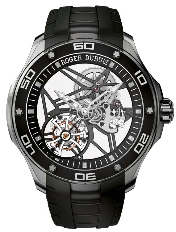 Эта эксклюзивная модель выполнена в титановом корпусе и оснащена скелетонизированным механизмом с дифференциальным «парящим» турбийоном. Новая линия Pulsion от часовой марки Roger Dubuis сочетает в себе надежность, прочность, легкость и прозрачность. Часы данной линии, вдохновленной миром Venturer можно узнать с первого взгляда по оригинальному технологическому решению – сапфировому стеклу, привинченному непосредственно к корпусу, на нижней части которого выгравированы арабские цифры, обработанные люминесцентным составом. Помимо этой характерной детали, скелетонизированная модель из титана с «парящим» турбийоном, созданные для людей, ведущих активный образ жизни, сочетают в себе динамичный, спортивный дизайн с технической изощренностью в лучших традициях современного высокого часового искусства.