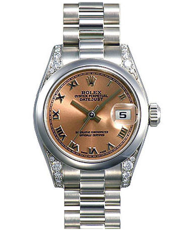 Женская модель Datejust 31mm в платине, очень элегантна. Корпус из платины инкрустирован 24 бриллиантами. Циферблат розовый с римскими цифрами. Механизм с автоподзаводом на 31 камне, Caliber 3130, запас хода 42 часа. Браслет President из платины.