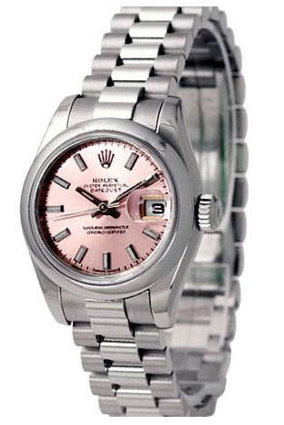 Женская модель Datejust 31mm в платине, очень элегантна. Циферблат розовый с люминесцентными индексами. Механизм с автоподзаводом на 31 камне, Caliber 3130, запас хода 42 часа. Браслет President из платины.