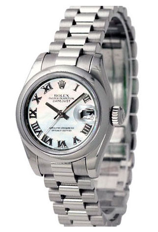 Женская модель Datejust 31mm в платине, очень элегантна. Циферблат перламутровый с римскими цифрами из белого золота. Механизм с автоподзаводом на 31 камне, Caliber 3130, запас хода 42 часа. Браслет President из платины.