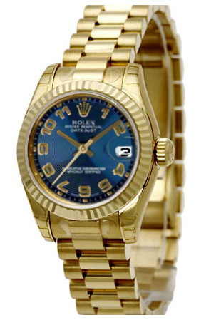 Rolex Datejust 31мм, корпус из желтого 18kt золота (размер 31мм , 11мм толщина). Рифленный безель. Циферблат синий с золотыми накладными Арабскими цифрами. Механизм с автоподзаводом, калибра Caliber 3130 на 31 камне, запас хода 42 часа. Браслет President из желтого 18к золота.