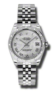 Элегантная модель в размере 31 мм. Корпус стальной, безель из белого золота инкрустирован 24 бриллиантами. Циферблат перламутровый, римские цифры.Браслет стальной Jublilee. Хронометр - Сертификация COSC.