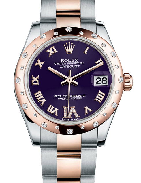 В компании Rolex отделка часов Datejust Lady 31mm драгоценными камнями возведена в ранг искусства. Ее выполняют из тщательно отобранных бриллиантов только опытные, владеющие самыми современными технологиями мастера. Rolex предъявляет предельно строгие требования к каждому ювелирному камню: так, бриллианты обязательно должны быть бесцветными, не содержать вкраплений и иметь безупречное происхождение. Благодаря тщательной работе преданных своему делу ювелиров, из союза часов Rolex и драгоценных камней рождается нечто гораздо большее, чем сумма их достоинств. Данная модель имеет выпуклый безель, украшенный 24 бриллиантами, увеличительное сапфировое стекло с антибликовым покрытием, циферблат фиолетово-пурпурный, римские цифры, цифра шесть украшена драгоценными камнями, механизм калибра 2235 с устройством автоматического подзавода «Вечный ротор». Браслет Oyster – это совершенное сочетание формы и функциональности, эстетики и технологических достижений.