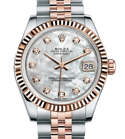 Корпус из нержавеющей стали и 18-каратного розового золота (диаметр 31мм, 11мм толщиной) с завинчивающейся заводной головкой Triplock. Юбилейный браслет со скрытой застежкой, белый перламутровый циферблат с 10 белыми бриллиантами. Механизм Caliber 3130 с автоматическим заводом. Oyster Perpetual сертифицированный COSC. Сапфировое стекло. Водонепроницаемость до 100 метров (330 футов).