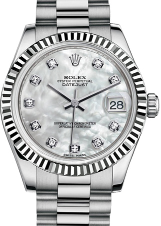 Rolex Datejust 31мм, корпус из белого 18kt золота (размер 31мм , 11мм толщина) Наличие собственного литейного производства позволяет Rolex отливать очень качественные золотые сплавы. Добавлением серебра, латуни, платины или палладия в определенных пропорциях получают 18-каратное золото разных оттенков: желтое, розовое или белое. Сплав, состоящий из металлов высшей степени очистки, сначала проходит через строгий контроль в собственной лаборатории с использованием ультрасовременного оборудования, после чего из него с таким же пристальным вниманием к качеству изготавливают детали часов. Стремление Rolex к совершенству берет начало у самых истоков.