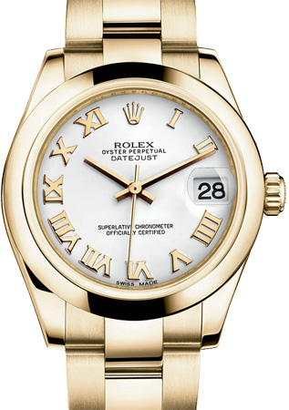 Rolex Datejust 31mm часы c18-каратного желтого золота (диаметр 31мм, 11мм толщиной) с завинчивающейся заводной головкой Triplock, гладкий безель из 18-каратного желтого золота , браслет Oyster с 18-каратного желтого золота со раскладной застежкой, циферблат белый с римскими цифрами. Механизм с автоподзаводом калибра Caliber 3130 на 31 драгоценном камне, сертифицированным хронометром COSC, устойчивое к царапинам сапфировое стекло, водонепроницаемость до 100 метров (330 футов).
