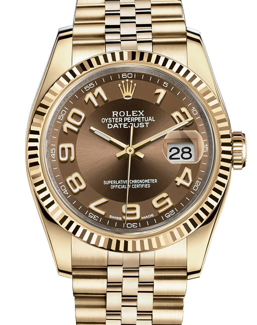 В самых ранних моделях Datejust дата начинала меняться за несколько часов до полуночи. В 1955 году у часов появился механизм переключения даты мгновенного действия, а для более удобного считывания показаний в окошко индикации даты была помещена линза с увеличением в 2,5 раза. Гармоничное сочетание бриллиантов, золота и стали в эффектном корпусе диаметром 36 мм. В модели Datejust 36 мм установлен калибр 3135 с автоматическим подзаводом, полностью разработанный и изготовленный мастерами Rolex. Как и все механизмы Rolex Perpetual, калибр 3135 имеет сертификат швейцарского хронометра, выдаваемый сверхточным часам, успешно прошедшим тестирование в Официальном швейцарском институте хронометрии (COSC). Конструкция, одинаковая для всех механизмов коллекции Oyster, придает модели несравненную надежность. Корпус 18-каратное желтого золото . Браслет - Jubilee c желтого золота. Циферблат - бронзовый с арабскими золотыми цифрами, с люминисцентным покрытием.